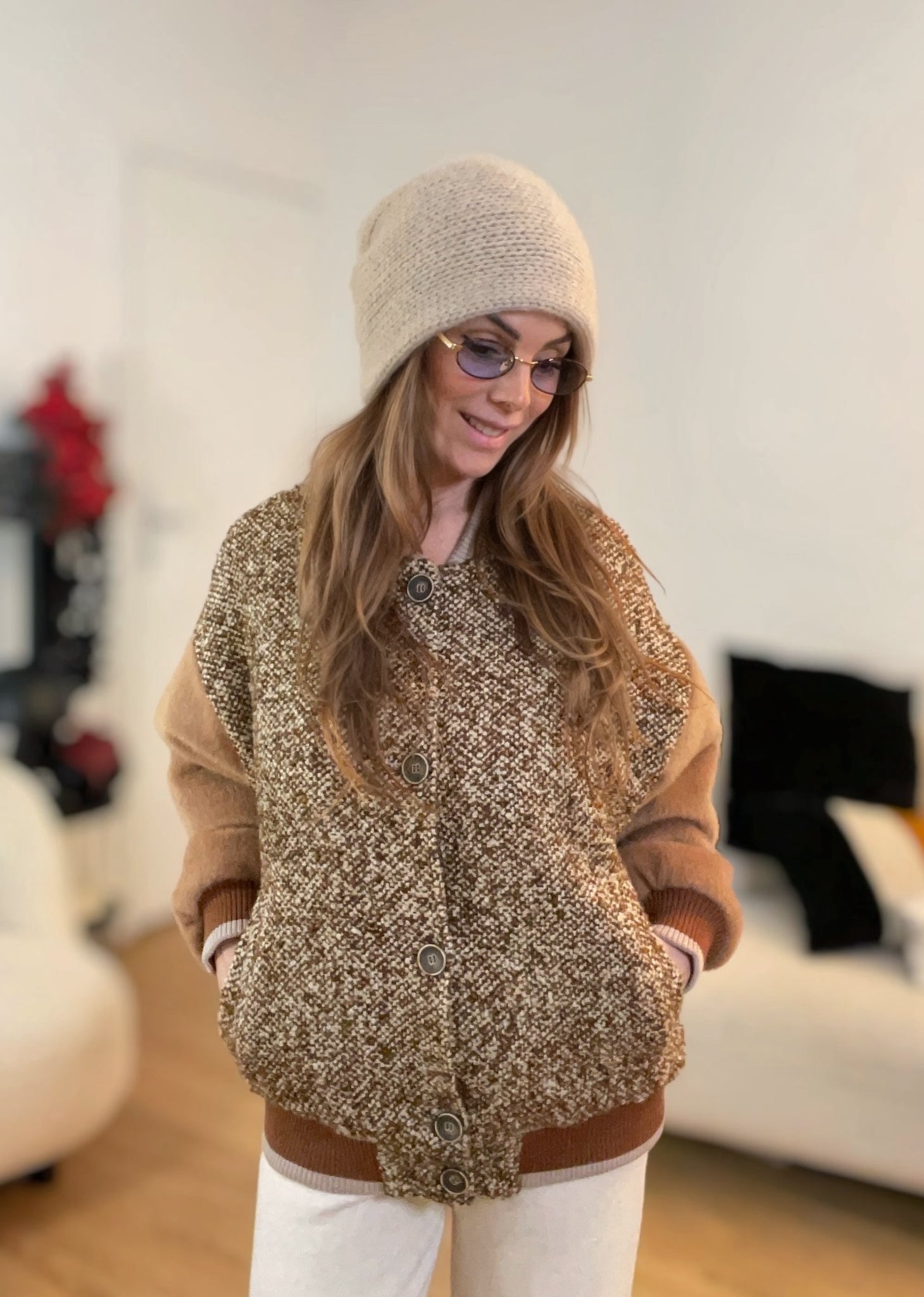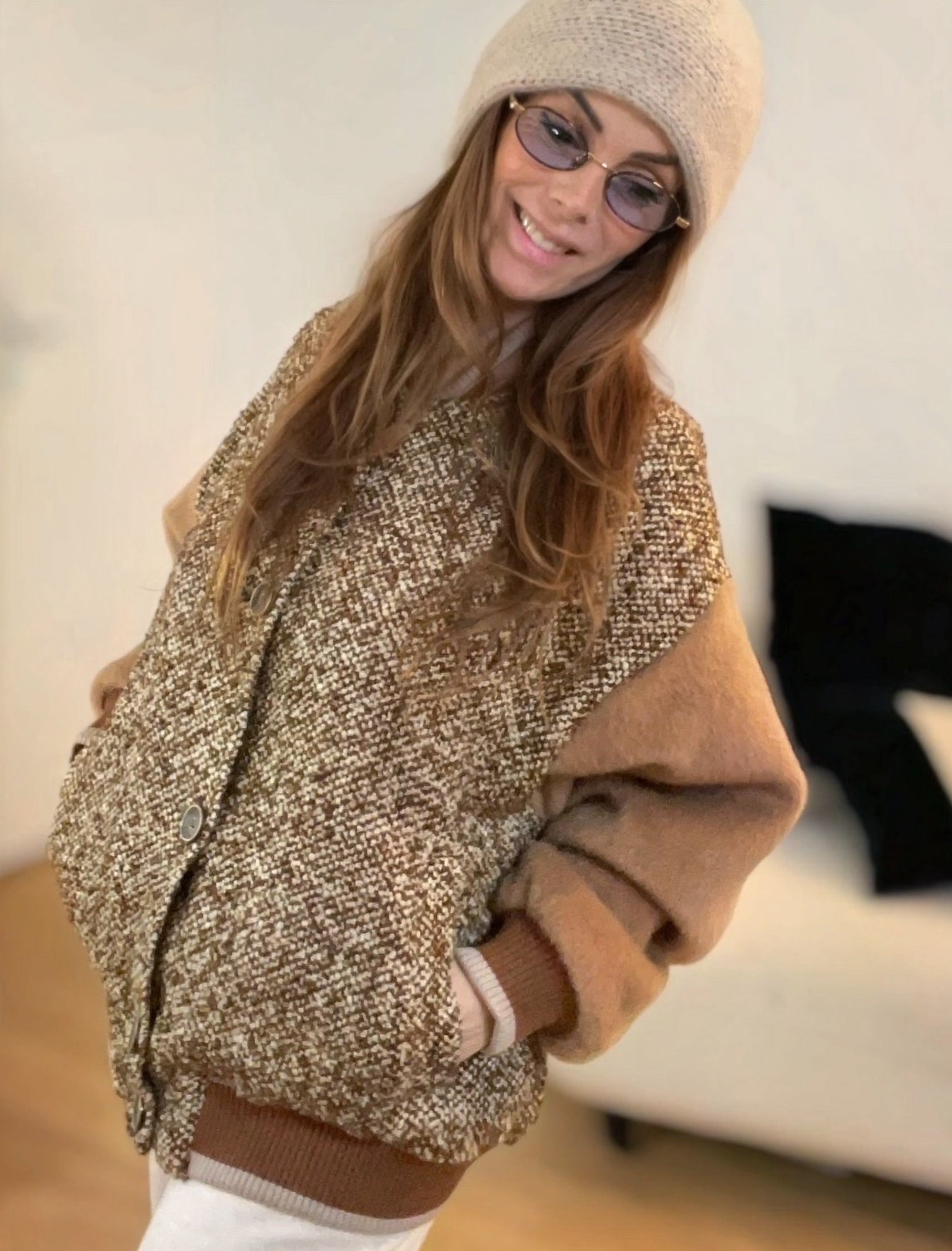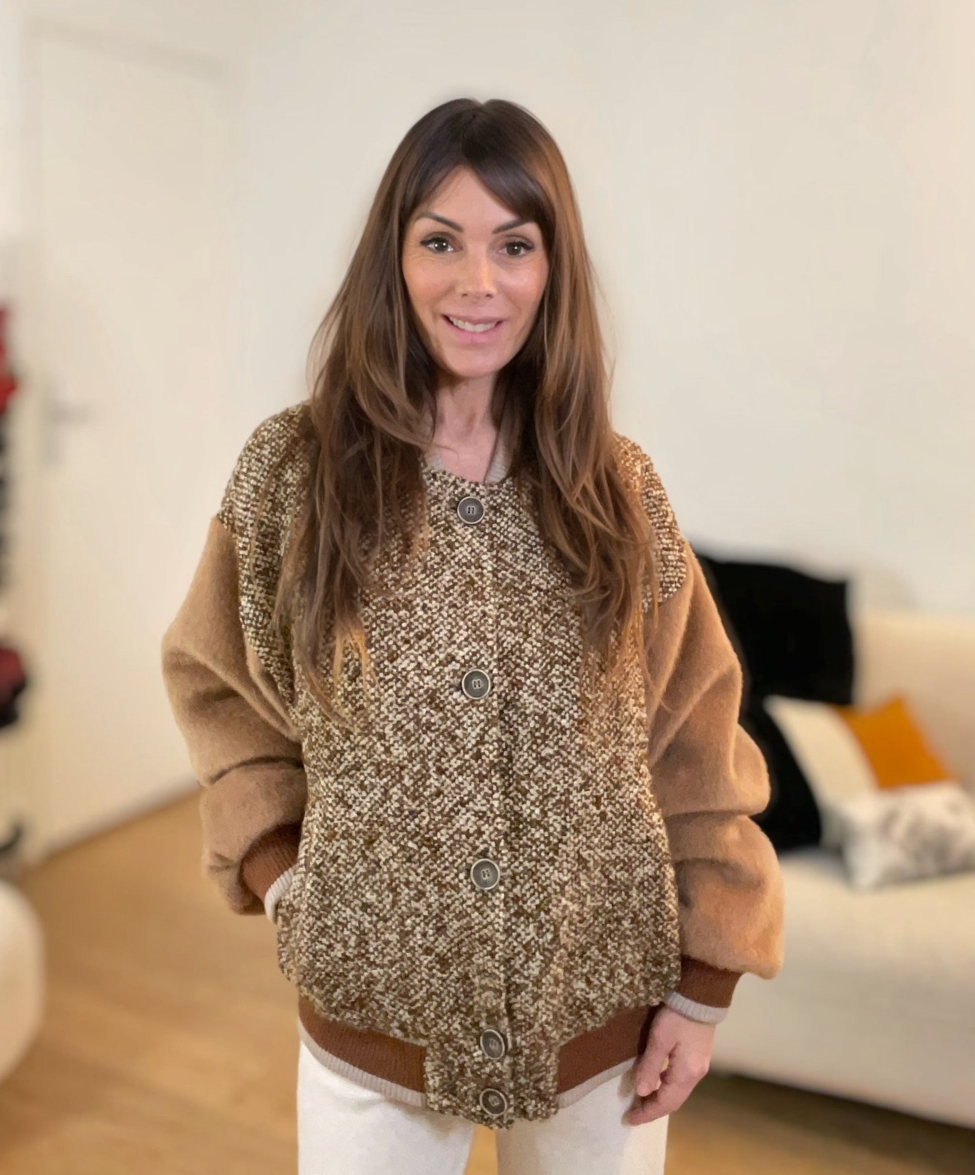 Confectionné dans un mélange de lainage texturé et de manches effet mohair, il séduit par son allure cocooning et son volume oversize.