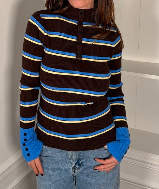 Son col cheminée structure le haut du buste tout en restant agréable à porter. Le faux boutonnage sur le devant apporte une touche chic d'inspiration polo, tandis que les rayures horizontales dynamisent la ligne. Les manches et le col contrastés viennent souligner le design avec subtilité.