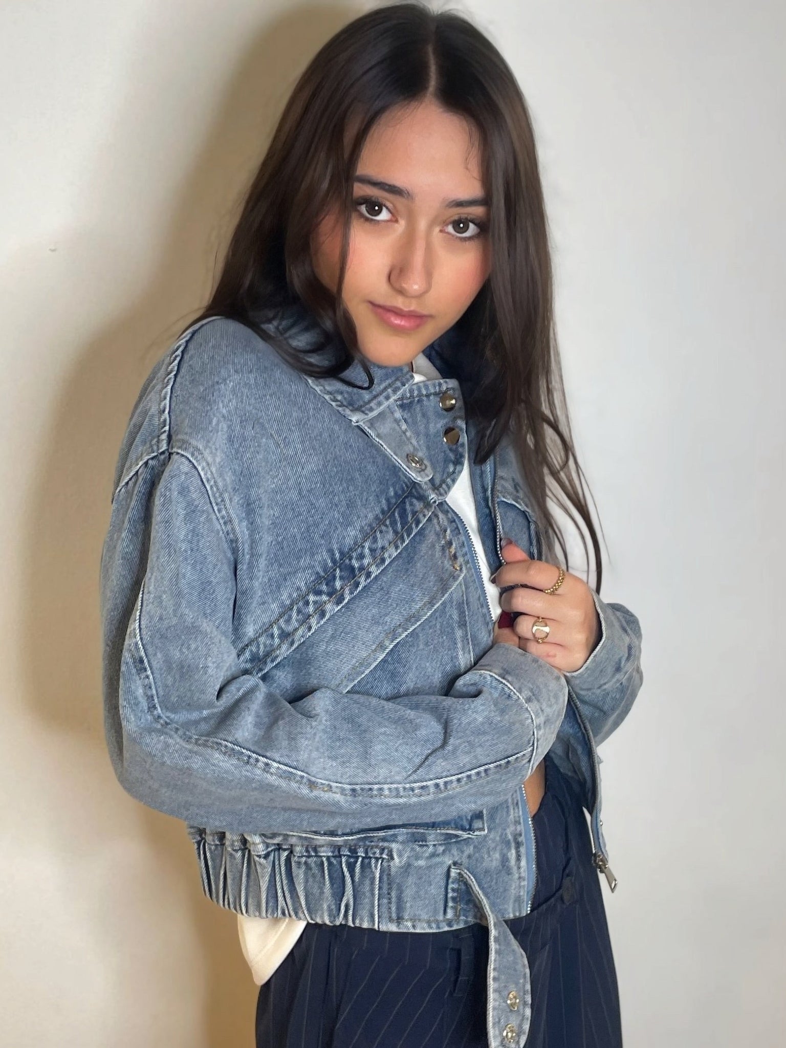 On aime son denim 100% coton et ses détails inspirés du vestiaire utilitaire : fermeture zippée, larges surpiqûres, empiècements travaillés et col structuré. Résultat : une veste qui donne tout de suite du caractère à un look, tout en restant facile à associer au quotidien.